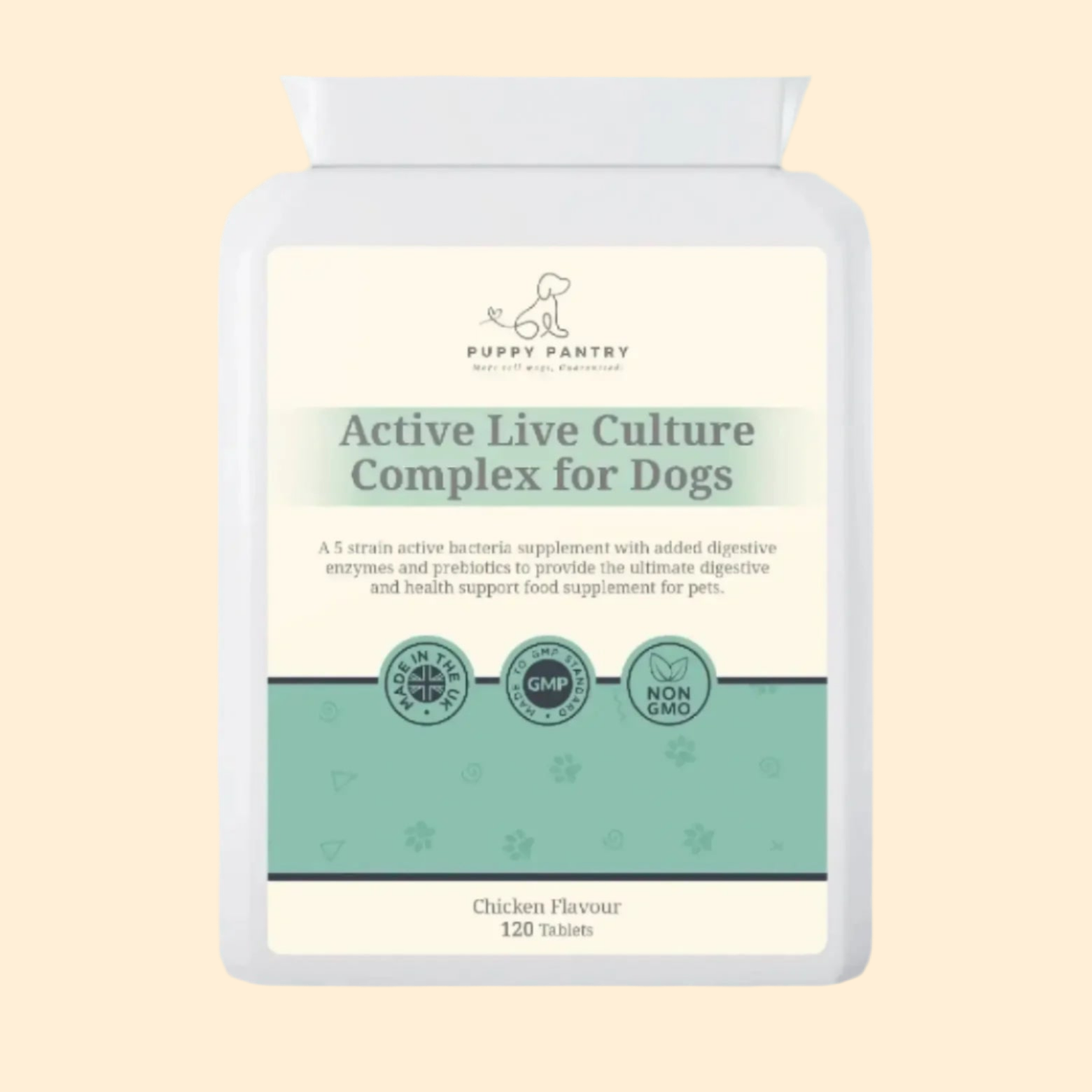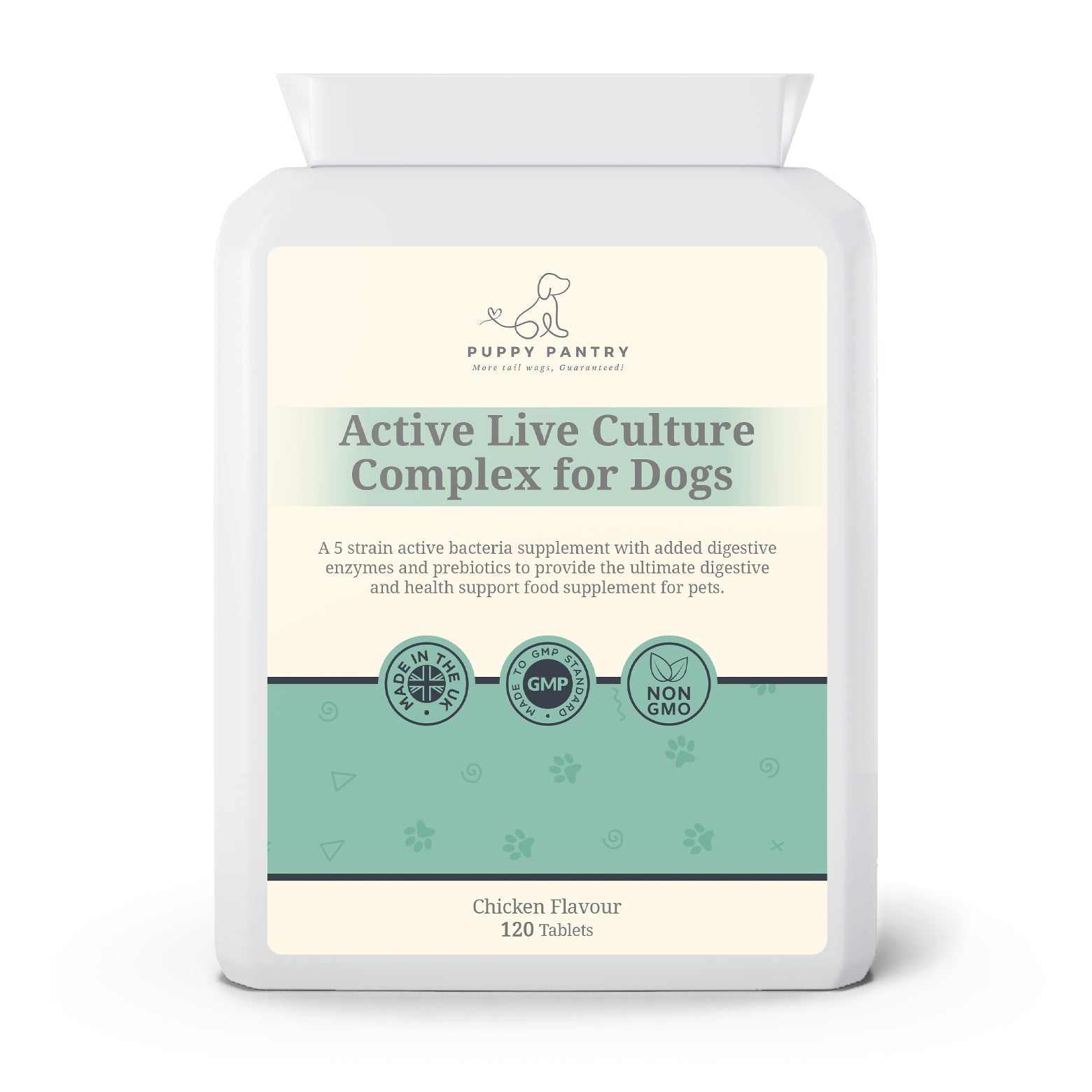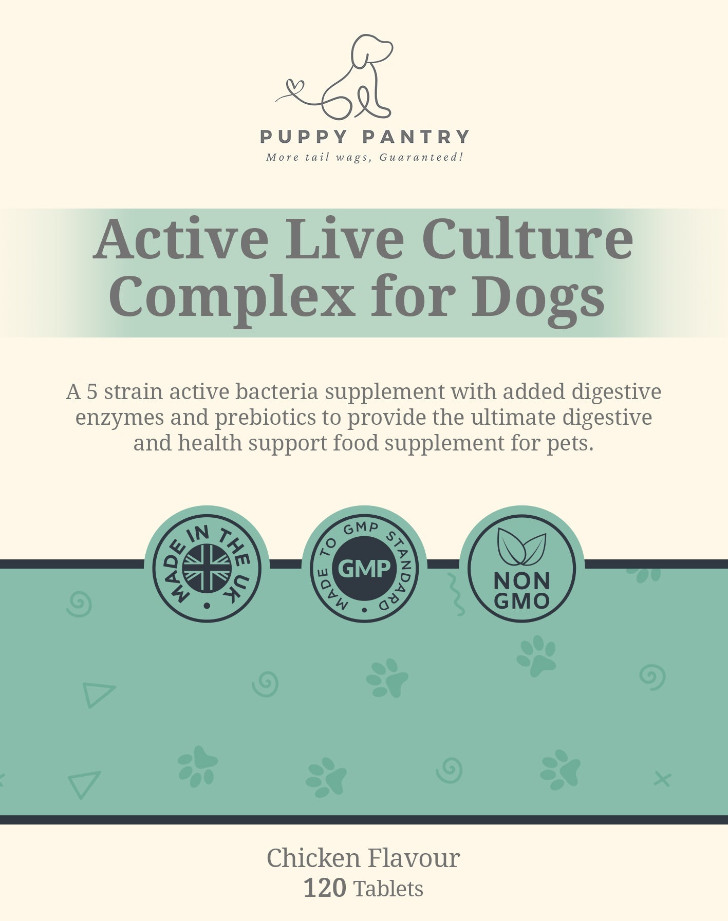Ingredients: Microcrystalline Cellulose, Fructooligosaccarides (from Inulin), Di Calcium Phosphate, Digestive Enzymes Blend (Amylase, Protease, Lipase, Cellulase, Lactase, Bromelaine), Active Live Culture Blend (Lactobacillus Acidophilus, Lactobacillus Plantarum, Lactobacillus Brevis, Bifidobacterium Animalis Lactis, Lactobacillus Rhamnosus), Chicken Flavour, Magnesium Stearate.